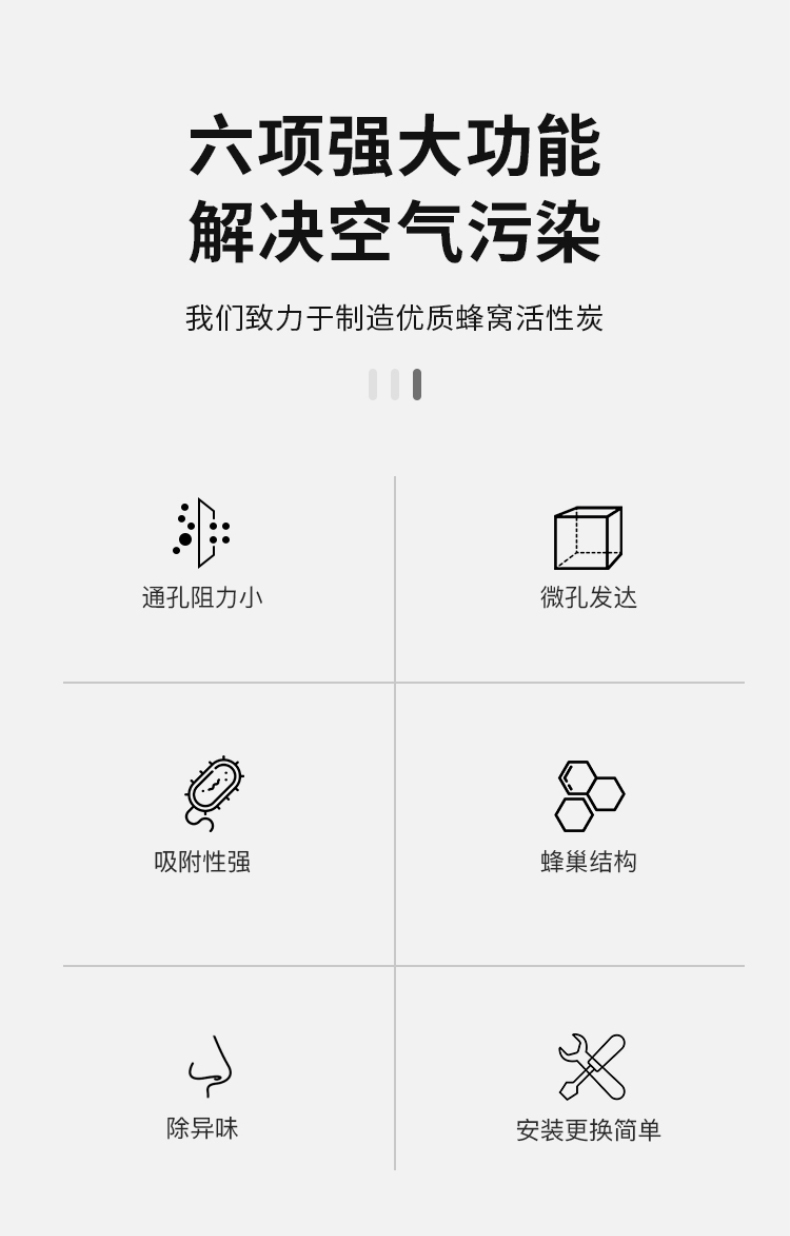 二、防油霧。蜂窩活性炭是微孔發(fā)達物質(zhì),微孔對于甲醛、苯、二甲苯等小分子粒徑的有很好,而對于油霧等大分子類物質(zhì),蜂窩活性炭的吸附能力就會減弱,油脂甚至?xí)氯涓C活性炭微孔。