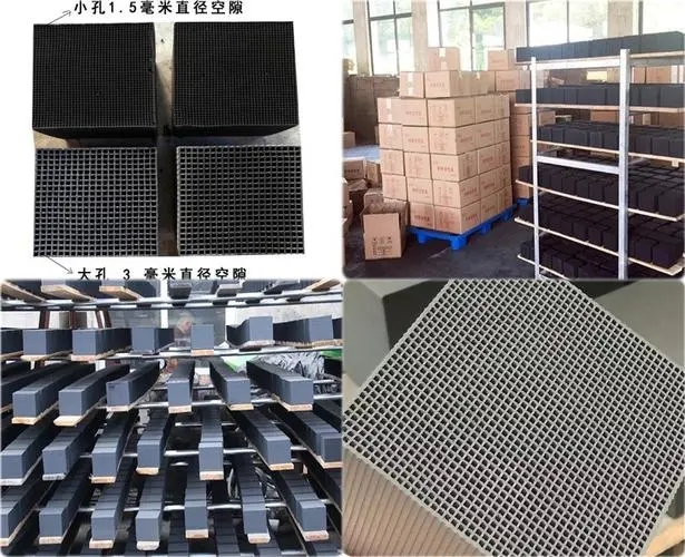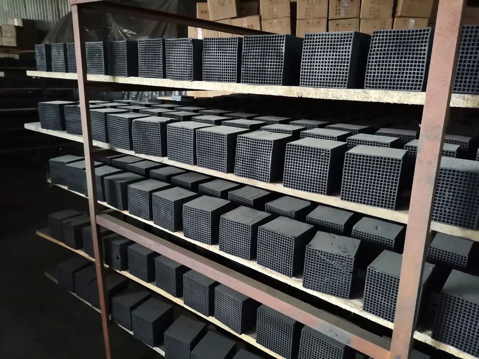 蜂窩活性炭生產(chǎn)工藝:活性炭+多種吸附助劑—混合—低溫炭化—中溫培化—成型—干燥—高溫活化—裝箱—成品