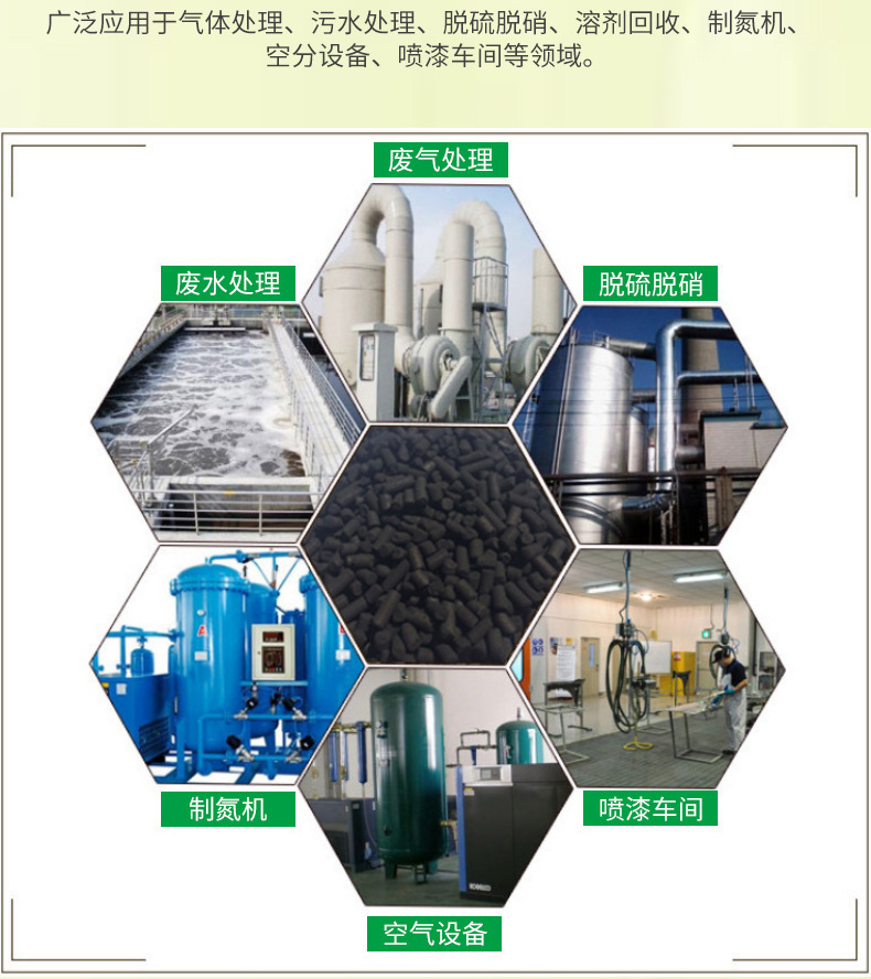 柱狀活性炭的應(yīng)用范圍非常廣泛。在水處理領(lǐng)域,柱狀活性炭被廣泛應(yīng)用于飲用水、工業(yè)廢水、污水處理等方面的凈化處理。它能夠有效地去除水中的有機(jī)物、重金屬離子、色素等污染物,提高水質(zhì)的純凈度和安全性。此外,柱狀活性炭還廣泛應(yīng)用于氣體凈化、食品工業(yè)、制藥工業(yè)、化工工業(yè)等領(lǐng)域。例如,在氣體凈化方面,柱狀活性炭能夠吸附空氣中的有害氣體和異味,提高室內(nèi)空氣質(zhì)量。在食品工業(yè)中,柱狀活性炭被用作脫色劑、除臭劑、脫味劑等,以改善食品的口感和品質(zhì)。在制藥工業(yè)中,柱狀活性炭被用于藥物的精制和提純,提高藥物的純度和質(zhì)量。在化工工業(yè)中,柱狀活性炭被用作催化劑載體、吸附劑等,以促進(jìn)化學(xué)反應(yīng)的進(jìn)行和提高產(chǎn)品的純度。