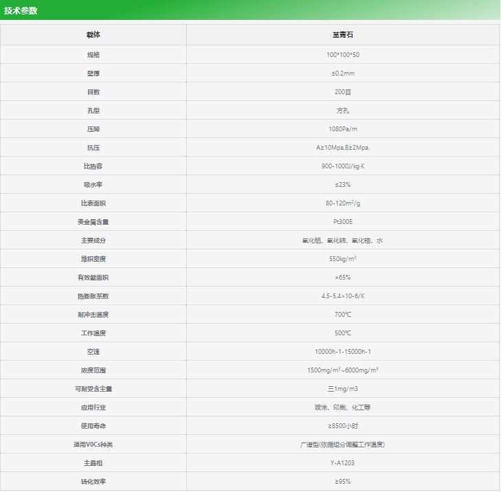 蜂窩陶瓷貴金屬催化劑采用堇青石蜂窩陶瓷體作為*載體,γ-Al2O3為第二載體,以貴金屬Pd、Pt為主要活性組分,是一種新型的有機(jī)廢氣凈化催化劑。貴金屬催化劑由特殊工藝制成1-2nm鉑基高活性組分,通過特有工藝鉚合在高比表面積載體之.上結(jié)合供氧載體,制成廣譜性VOCs氧化催化劑。該催化劑其具有高穩(wěn)定性、長壽命以及高性價(jià)比優(yōu)勢,適用于CO及RCO催化燃燒裝置。