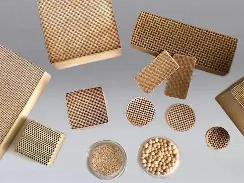 顆粒為最早應(yīng)用的催化劑形狀,催化劑前體一般均是粉末形狀,后經(jīng)成型成為不同形狀的顆粒。顆粒催化劑最主要的問題是: 壓降大,造成裝置能耗過大,氣流量小。其次機(jī)械強(qiáng)度小?,F(xiàn)在只應(yīng)用于小流量廢氣處理的小裝置中,其用量占燃燒催化劑的10%。蜂窩貴金屬催化劑具有均勻分布的多孔道結(jié)構(gòu)、孔徑尺寸改變范圍較寬(微孔,介孔,大孔)、比表面積大(>600m²/g)、儲(chǔ)氧能力強(qiáng)、骨架組分具有多樣性等特點(diǎn)。