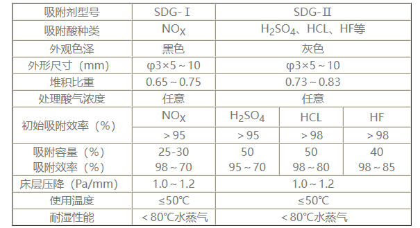 酸氣吸附效果較好的產(chǎn)品主要集中在SDG酸氣吸附劑和氧化鐵脫硫劑兩類,具體選擇根據(jù)實際處理的酸氣類型,使用場景及工藝要求綜合考慮。SDG酸氣吸附劑是當前應用較廣的酸性氣體凈化材料,具有吸附效率高,適用性廣,對環(huán)境友好,無二次污染和分型設計的特點。SDG酸氣吸附劑分為1型和二型,分別對硝酸霧和硫酸,鹽酸等氣體有較好的處理效果。