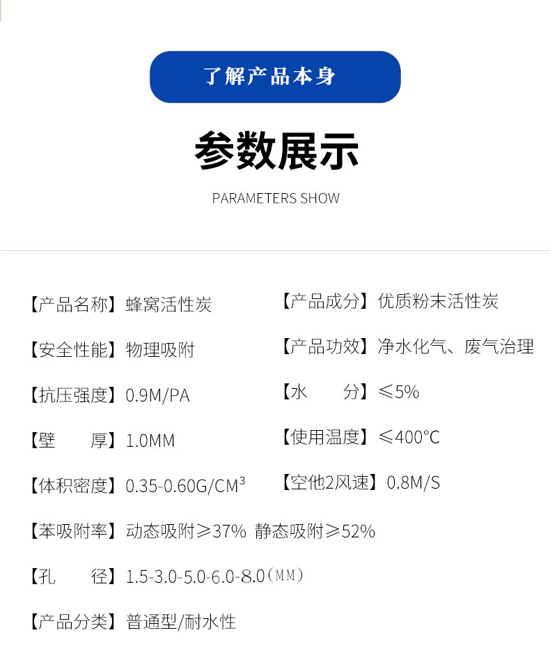 蜂窩活性炭是一種環(huán)?;钚蕴?,以煤質(zhì)、木質(zhì)碳粉為原料,經(jīng)蜂模具擠壓成型,晾曬后高溫活化燒制而成,能降低異味和污染物,主要分為兩種,防水型和普通型。防水型蜂窩活性炭強(qiáng)度更高,在廢氣吸附方面使用范圍更廣,不易碎,不坍塌,不自燃,燃點(diǎn)高于400℃,遇水不化。蜂窩活性炭外觀規(guī)整,通過性強(qiáng),阻力小,碘值高,吸附能力強(qiáng),使用壽命長,更換周期久,易更換;每立方可吸附廢氣量高達(dá)120公斤,可脫附再生,循環(huán)使用。蜂窩活性炭能有效降低異味和污染物,到廢氣排放標(biāo)準(zhǔn)。廣泛用于工業(yè)廢氣處理,催化燃燒,VOCS處理,噴漆房除味等吸附凈化領(lǐng)域。